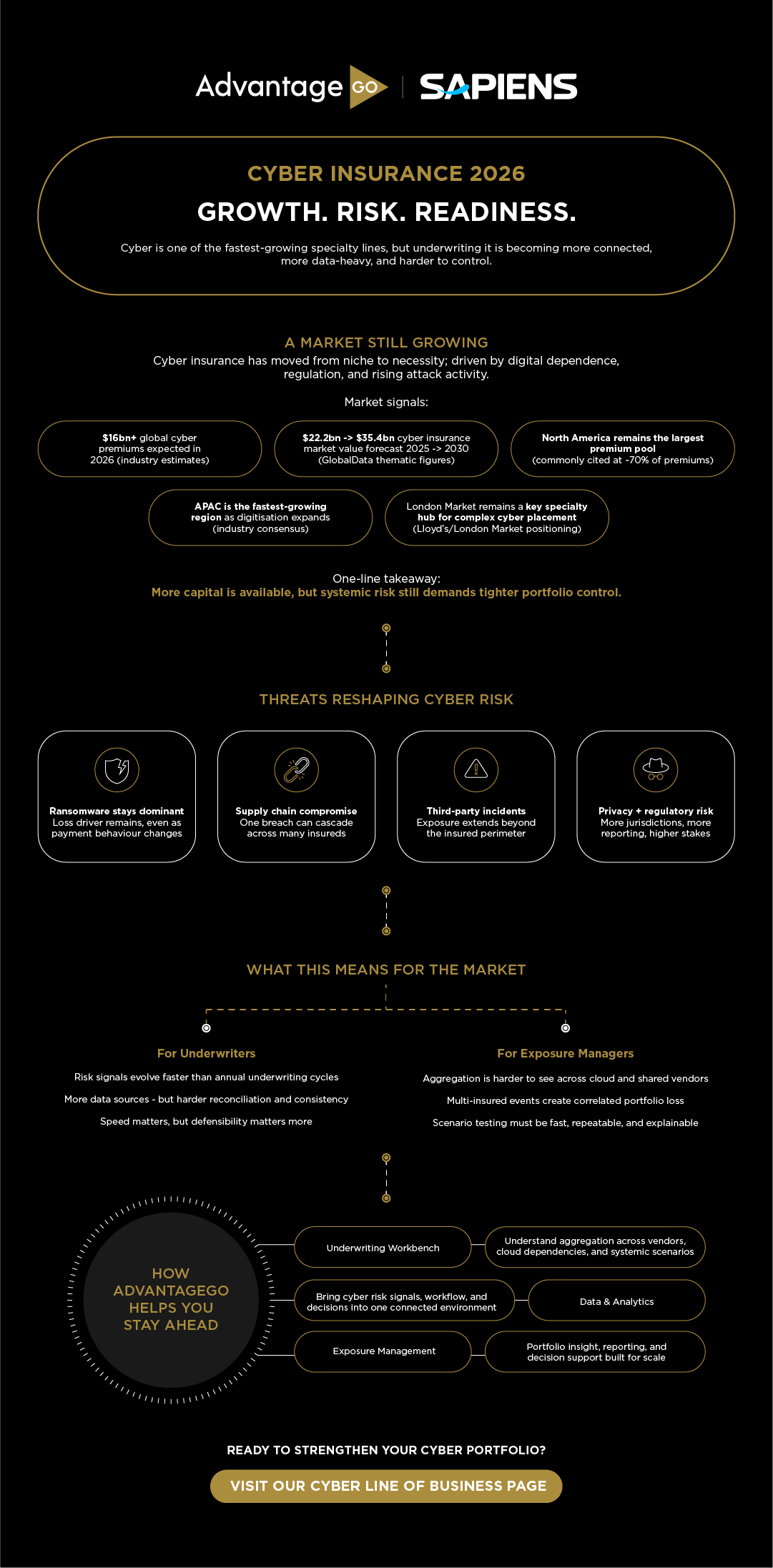 Infographics CYBER INSURANCE 2026: Growth. Risk. Readiness. AdvantageGo 1 Min Read 23.02.26 AdvantageGo Content Infographics Cyber is selling, but it’s messy to underwrite. A lot of companies run on the same few cloud platforms, MSPs, and core software. When one of those has a bad day, it does not stay contained. You can end up with a pile-up across your book. Things are steadier than the pricing swings of the last few years, but the questions have got tougher. Brokers want answers faster. Leaders want to know where you are building up exposure. And you need to spot the “shared supplier” problem before it becomes a loss event. How AdvantageGo helps AdvantageGo puts underwriting and exposure in the same place, so teams can work with the full picture. * Decide faster, with the right context * See concentration across shared vendors and systemic scenarios * Keep decisions clear, consistent, and audit-ready Previous InfographicNext Infographic Knowledge hub Visit our knowledge hub to make informed decisions on your (re)insurance transformation. Visit knowledge hub Oops! There was an error with your request. Please refresh and try again. Sorry! There are no results that match your criteria. Discuss your underwriting transformation with our experts