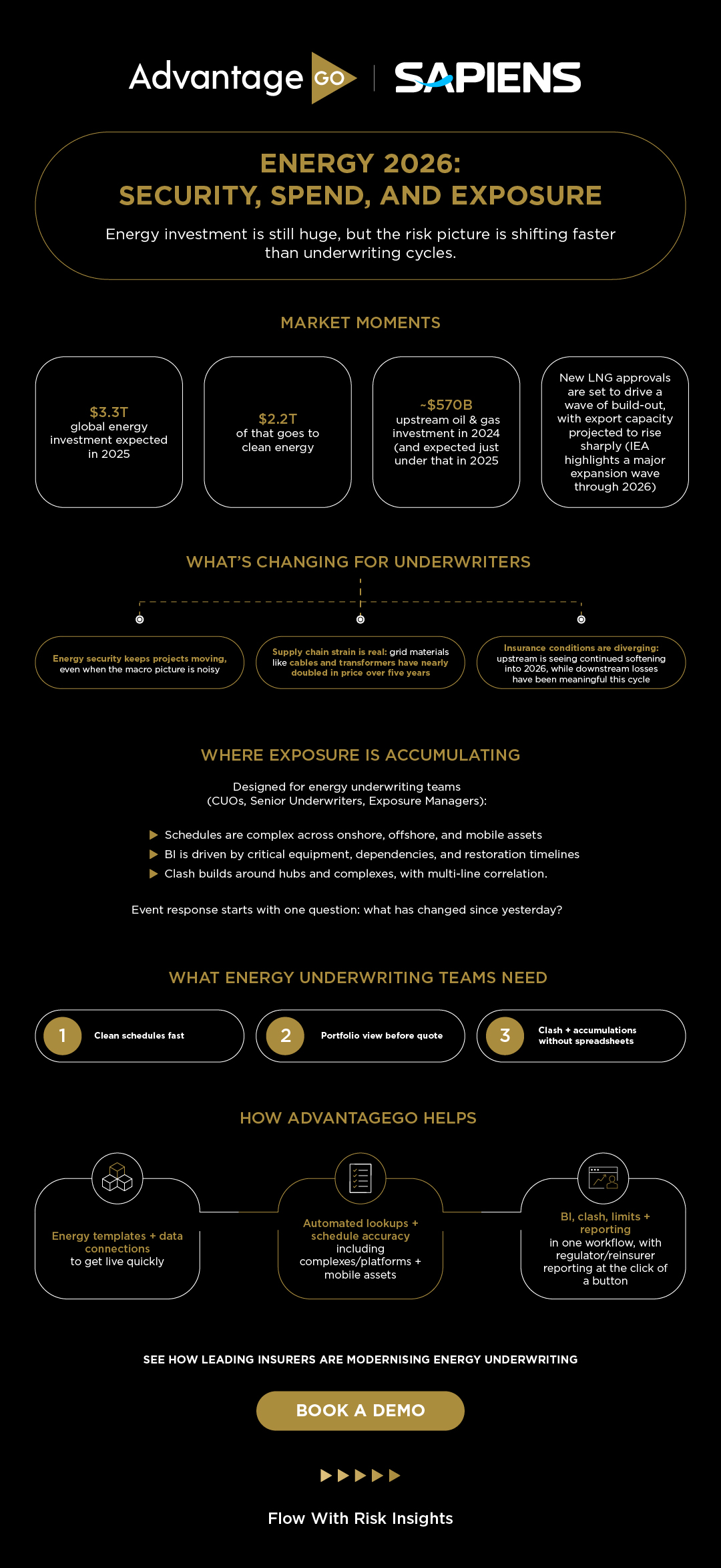 Infographics Energy 2026: Security, spend, and exposure AdvantageGo 2 Min Read 21.04.26 AdvantageGo Content Infographics Energy investment is still huge, but the risk picture is shifting faster than underwriting cycles. Market moments * $3.3T global energy investment expected in 2025 * $2.2T of that goes to clean energy * ~$570B upstream oil and gas investment in 2024 (and expected just under that in 2025) * New LNG approvals are driving a build-out wave, with export capacity projected to rise sharply (major expansion through 2026) What’s changing for underwriters Energy underwriting is being shaped by three forces: * Energy security keeps projects moving, even when the macro picture is noisy * Supply chain strain is real: grid materials like cables and transformers have nearly doubled in price over five years * Insurance conditions are diverging: upstream is seeing continued softening into 2026, while downstream losses have been meaningful this cycle Where exposure is accumulating Designed for energy underwriting teams (CUOs, senior underwriters, exposure managers): * Schedules are complex across onshore, offshore, and mobile assets * BI is driven by critical equipment, dependencies, and restoration timelines * Clash builds around hubs and complexes, with multi-line correlation Event response starts with one question: what has changed since yesterday? What energy underwriting teams need * Clean schedules fast * Portfolio view before quote * Clash and accumulations without spreadsheets How AdvantageGo helps * Energy templates and data connections to get live quickly * Automated lookups and schedule accuracy, including complexes, platforms, and mobile assets * BI, clash, limits and reporting in one workflow, with regulator and reinsurer reporting at the click of a button Ready to get started? Book a demo Previous Infographic Knowledge hub Visit our knowledge hub to make informed decisions on your (re)insurance transformation. Visit knowledge hub Oops! There was an error with your request. Please refresh and try again. Sorry! There are no results that match your criteria. Discuss your underwriting transformation with our experts